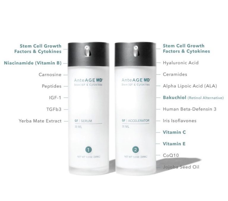 AnteAGE là dòng sản phẩm chứa các growth factor cùng với cytokine được nuôi cấy từ tế bào gốc tủy xương. Sản phẩm được bào chế dưới dạng serum, dung dịch dùng cho lăn kim và một số chế phẩm hỗ trợ trẻ hóa da. Những thành phần phổ biến gồm hyaluronic acid, các peptide tái tạo và một vài chất bảo quản như benzyl alcohol hay dehydroacetic acid. Các yếu tố này có tác dụng kích thích quá trình phục hồi biểu bì và giảm hiện tượng viêm khi dùng đúng chỉ định.