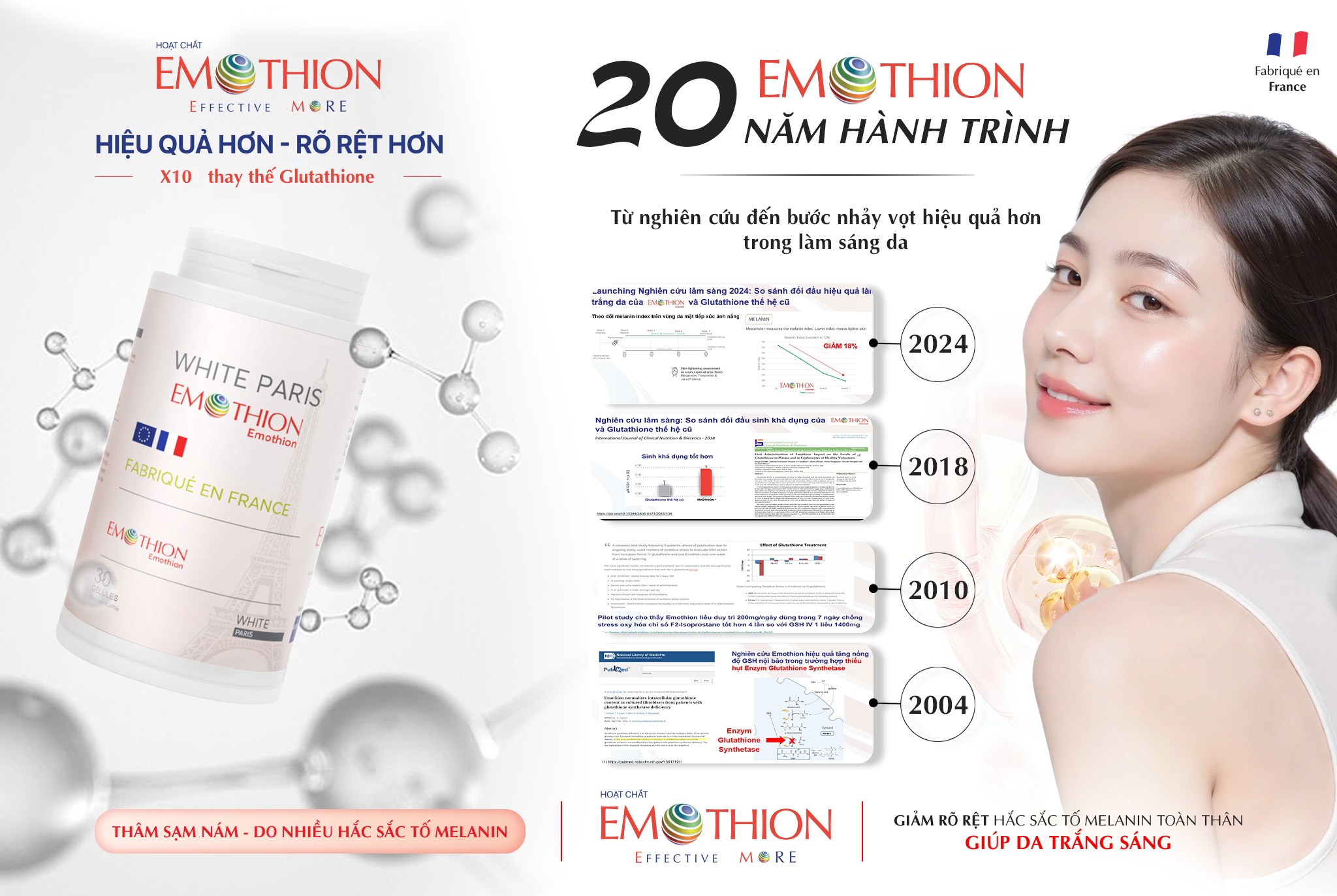 MÔ TẢ VỀ SẢN PHẨM Emothion LÀ GÌ? Emothion là một viên uống bổ sung nhập khẩu từ Pháp, phát triển xung quanh hoạt chất Emothion® — một dạng Glutathione thế hệ mới có khả năng hấp thu vượt trội so với glutathione truyền thống. Sản phẩm này được thiết kế nhằm tăng cường khả