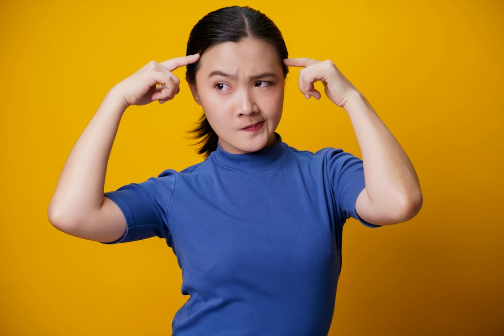 Hình ảnh minh họa giảm mỡ mặt với cách giảm mỡ mặt an toàn: người phụ nữ châu Á bối rối trên nền vàng làm nổi bật phương pháp giảm mỡ mặt hiện đại, theo lời khuyên giảm mỡ mặt của chuyên gia da liễu và tiêu chuẩn thẩm mỹ Lona.