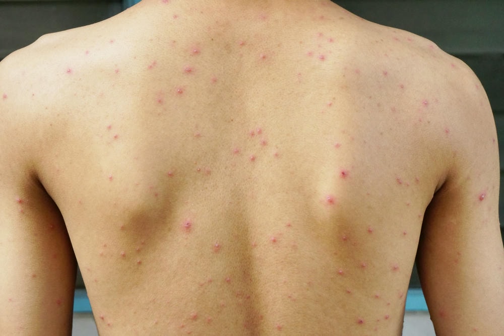 • Mụn trứng cá vùng thân: biểu hiện bằng sẩn, mụn mủ, đầu đen/đầu trắng, có thể đau, xuất hiện ở lưng, vai, ngực.